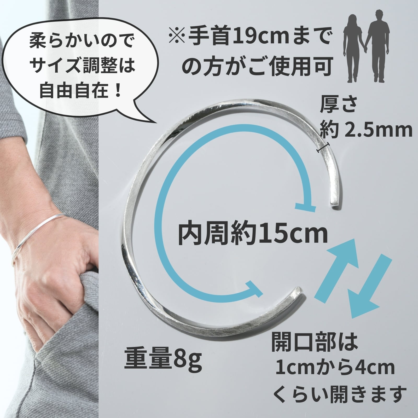 開口部は約1cmから4cmまで調整でき、手首に合わせてフィットします。