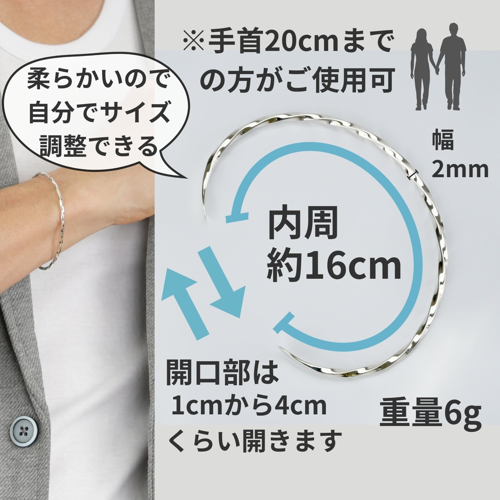柔らかいシルバー素材により、 ご自身でサイズ調整が可能。 手首約20cmまで対応し、誰でも自然にフィットします。 サイズ選びで失敗しにくいのも魅力です。